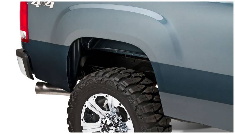 Fender Flares Extend-A-Fender Style 2Pc Rear You've equipped your vehicle with oversize wheels and tires for serious off-road traction and clearance. Now you need extra tire coverage to protect your rig's body and maybe even comply with local laws. Bushwacker Extend-A-Fender Flares deliver premium-grade protection and style matched to oversized tires, yet as tough as they are, they go on easily with no drilling required. You can install them in minutes and enjoy them for years. Our exclusive Dura-Flex 2000 material is designed for added durability and flexibility with built-in UV protection. Your Extend-A-Fender Flares resist chalking, cracking, and warping, whether you leave them with their OEM-style matte black finish or paint them for a totally personalized look. Either way, your truck will look factory-equipped for your off-road tires. Extend-A-Fender Flares go on easy, perform tough, and look great. Smooth, contoured look, these flares provide more protection than our OE Style Flares Tire coverage varies with vehicle: 1.25 In. - 3 In. Whether on-road or off, our heavy-duty hardware holds the flares securely in place 100% UV protected smooth matte black smooth finish can be easily painted Precision engineered for a perfect fit and made of durable, yet flexible Dura-Flex 2000 ABS material
