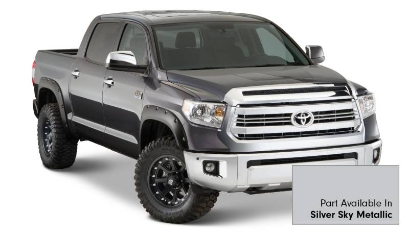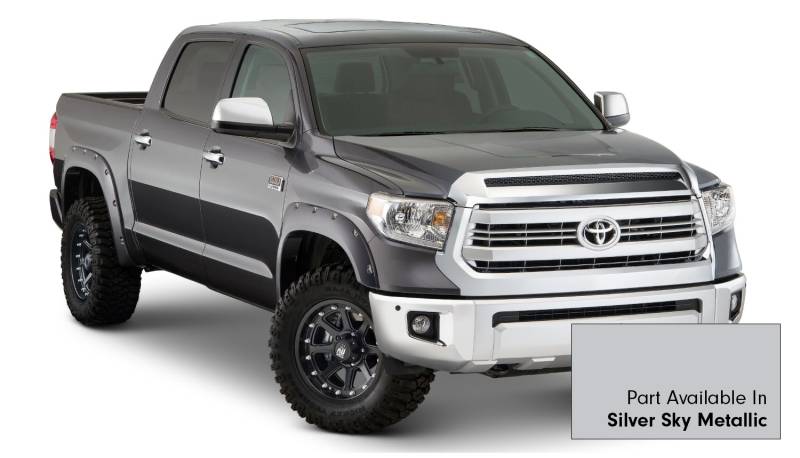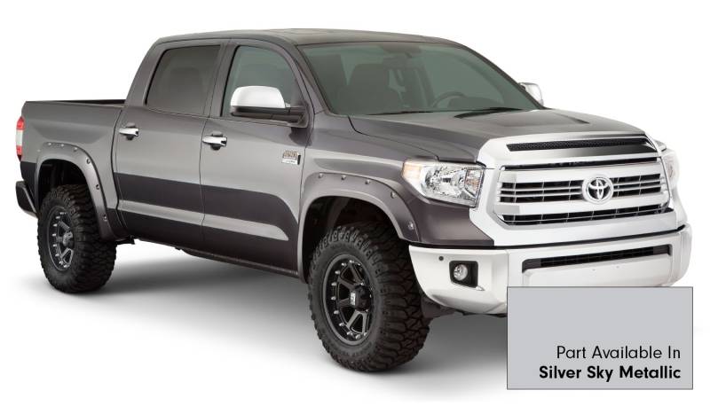 Fender Flares Pocket Style-Color Silver Sky Metallic Smooth Finish 4 Pc Bushwacker's rugged, iconic Pocket Style Fender Flares allow for more tire coverage and more clearance for trucks and SUVs while protecting the vehicle from dirt and debris. These flares are now available pre-finished to match the paint on your new Toyota Tundra, plus they have the edge trim and stainless steel hardware pre-installed for quick and easy installation and a perfect fit . Made from sturdy Dura-Flex 2000 material, these flares are warp-resistant and tailor made for each application. Despite their bolted-on appearance, these flares install easily with minimal drilling for a secure fit. And since they're ready to install out of the box, there's no waiting on paint, and no hassle with installation. Our OEM-quality finishes perfectly match the finish of new trucks and SUVs. Tire coverage varies with vehicle: 0.5 In.- 3 In. Whether on-road or off, our heavy-duty hardware holds the flares securely in place Made of durable, yet flexible Dura-Flex 2000 ABS material Installs easily with little to no drilling/trimming required -- all hardware is included
