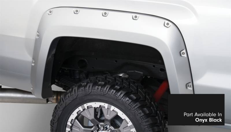 Fender Flares Pocket Style-Color Onyx Black Smooth Finish 4 Pc Bushwacker's rugged, iconic Pocket Style Fender Flares allow for more tire coverage and more clearance for trucks and SUVs while protecting the vehicle from dirt and debris. These flares are now available pre-finished to match the paint on your new GMC Sierra, plus they have the edge trim and stainless steel hardware pre-installed for quick and easy installation and a perfect fit . Made from sturdy Dura-Flex 2000 material, these flares are warp-resistant and tailor made for each application. Despite their bolted-on appearance, these flares install easily with minimal drilling for a secure fit. And since they're ready to install out of the box, there's no waiting on paint, and no hassle with installation. Our OEM-quality finishes perfectly match the finish of new trucks and SUVs. Tire coverage varies with vehicle: 0.5 In.- 3 In. Whether on-road or off, our heavy-duty hardware holds the flares securely in place Made of durable, yet flexible Dura-Flex 2000 ABS material Installs easily with little to no drilling/trimming required -- all hardware is included