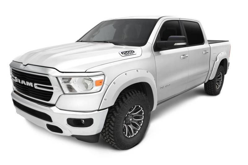 Fender Flares Pocket Style-Color Bright White Clear Coat Smooth Finish 4 Pc Bushwacker's rugged, iconic Pocket Style Fender Flares allow for more tire coverage and more clearance for trucks and SUVs while protecting the vehicle from dirt and debris. These flares are now available pre-finished to match the paint on your new Ram, plus they have the edge trim and stainless steel hardware pre-installed for quick and easy installation and a perfect fit . Made from sturdy Dura-Flex 2000 material, these flares are warp-resistant and tailor made for each application. Despite their bolted-on appearance, these flares install easily with minimal drilling for a secure fit. And since they're ready to install out of the box, there's no waiting on paint, and no hassle with installation. Our OEM-quality finishes perfectly match the finish of new trucks and SUVs. Tire coverage varies with vehicle: 0.5 In.- 3 In. Whether on-road or off, our heavy-duty hardware holds the flares securely in place Made of durable, yet flexible Dura-Flex 2000 ABS material Installs easily with little to no drilling/trimming required -- all hardware is included