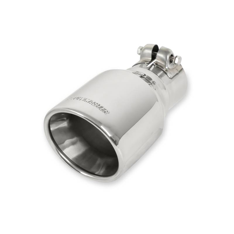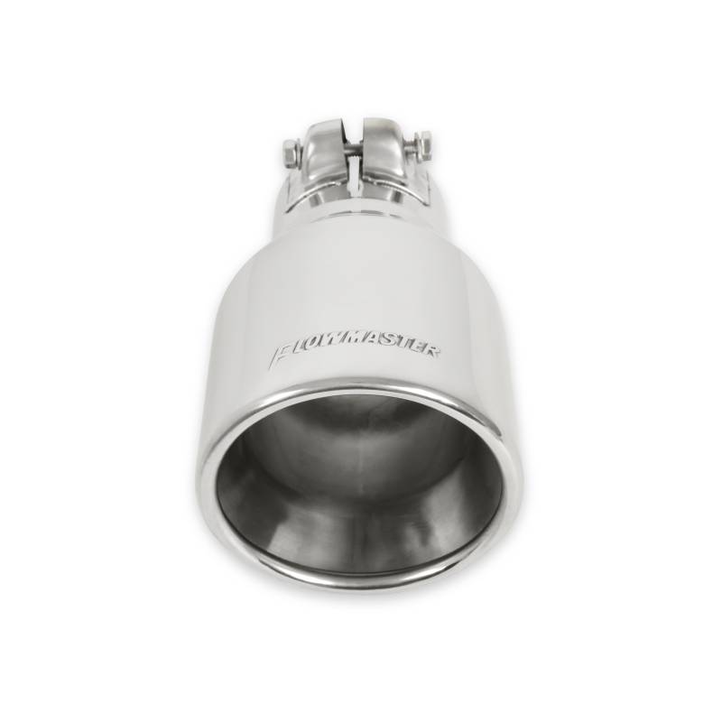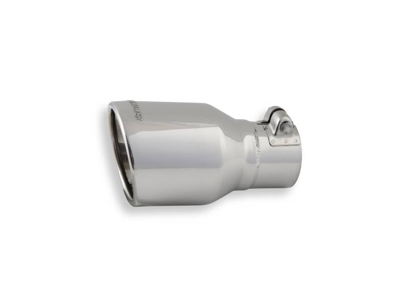 Exhaust tip, logo embossed polished stainless, double wall rolled edge angle cut, 4.00 in. tip diameter x 2.50 in. pipe diameter x 7.50 in. length, clamp on. Sold individually.