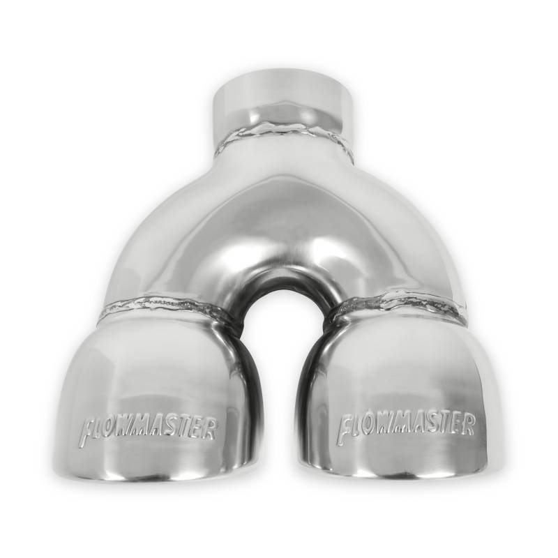 Exhaust tip, logo embossed polished stainless, rolled edge angle cut, 3.50 in. dual pipe diameter x 2.50 in. x 7.50 in., weld on. Sold individually.