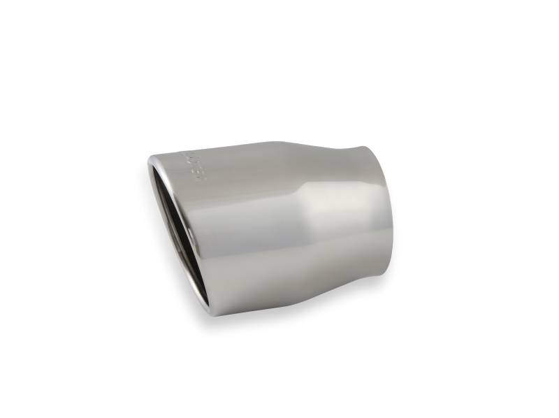 Polished stainless steel tip features weld-on mounting design for custom applications. Slips over 3.00 in. pipe and outer diameter measures 4.00 in. with angled, rolled edge and embossed Flowmaster logo.