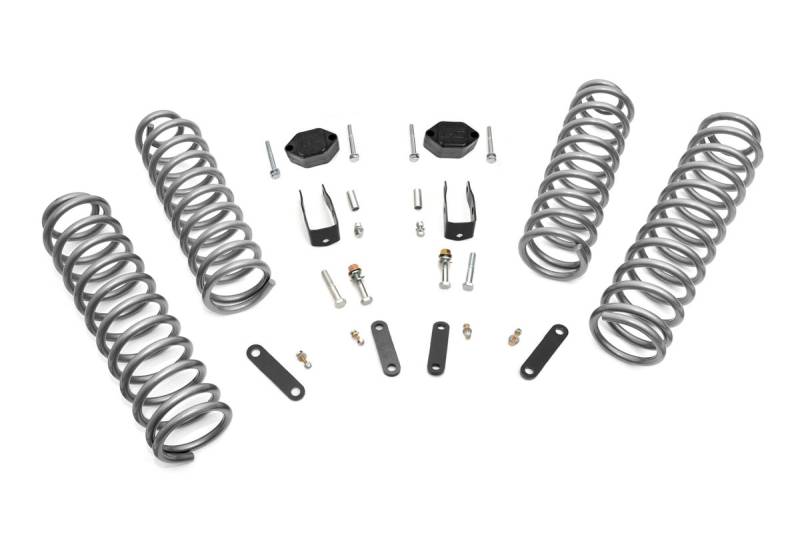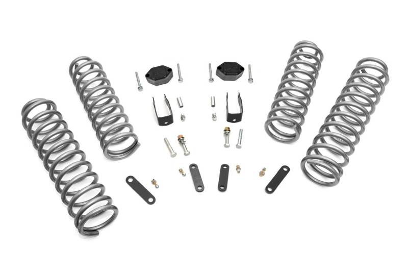 Elevate your Jeep's off-road capability and style with Rough Country's 2.5-Inch Suspension Lift Kit. Designed for larger wheels and tires, this kit increases ground clearance and delivers a bold, aggressive stance on and off the trail.Lifted Front and Rear Coil Springs: Enjoy a taller ride height while maintaining factory-like ride comfort. These coils are tuned to match the OEM spring rate, providing balanced handling whether you're navigating rocky terrain or cruising pavement.Configurable Shock Options: Choose the perfect ride feel for your driving needs. This kit offers nitrogen-charged N3 shocks, monotube V2 and M1 options, or the premium M1R remote reservoir shocks for ultimate performance and control.Hassle-Free Installation: This kit includes all necessary components for a simple, bolt-on installation, getting you trail-ready without complicated modifications.Trail-Tested Durability: Backed by Rough Country's Limited Lifetime Replacement Warranty, this suspension lift is built to handle harsh environments and rugged adventures.Upgrade your Jeep today and conquer the trail with Rough Country's 2.5-Inch Suspension Lift Kit, where performance meets unmistakable style.