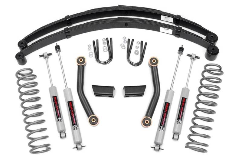 All-Inclusive Lift Solution: Rough Country's 3" Lift Kit for the Jeep Cherokee XJ includes everything you need for a complete upgrade, delivering improved stance, ride quality, and off-road performance.Next-Level Shock Performance: This kit comes equipped with our Nitrogen-charged N3 shocks featuring custom 10-stage variable valving. Engineered for versatility, they deliver a smooth, controlled ride on the pavement and superior performance when the terrain gets rough. For even greater customization, upgrade to our premium M1 monotube shocks for enhanced stability and cooling or step up to V2 monotube shocks for maximum off-road control and long-lasting durability.Lifted Coil Springs for Clearance: Precision-engineered front coil springs provide consistent ride height and help level your Cherokee while allowing clearance for up to 31" tires. Tackle trails or daily driving with confidence.Customizable Rear Suspension: Choose between standard rear add-a-leaf springs for an affordable boost or upgrade to full replacement lifted leaf packs to refresh your suspension and maximize ride quality.