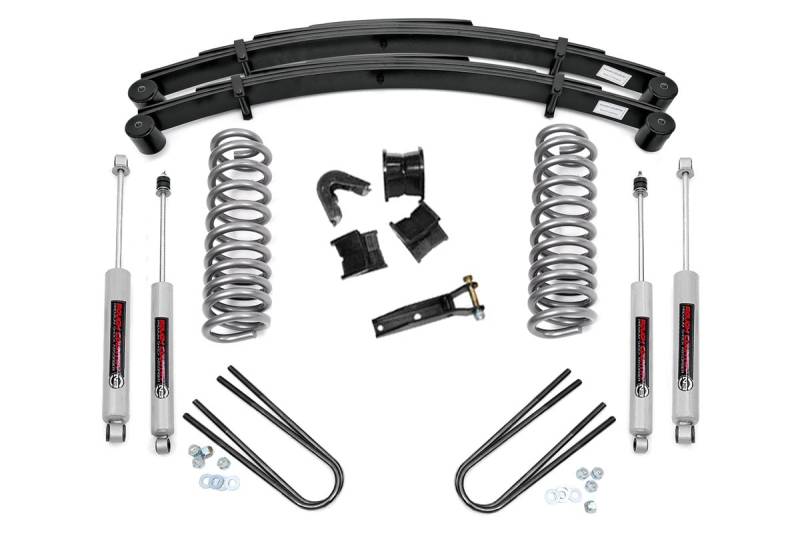 Give your 78-79 Ford Bronco an aggressive look from front to rear with Rough Country's 4" Ford Suspension Lift Kit! This easy-to-install leveling kit raises the front of your vehicle to be equal height with the rear for a leveled, flush look that gives a better ride height and more aggressive appearance.\ This kit features a set of front, durable coil springs and rear leaf springs allowing you gain additional ride height without sacrificing ride quality or performance. A set of 7 degree c-bushings and track bar drop bracket are provided to keep everything at optimum angles for a factory-like ride, even after lifting. Our fabricated rear blocks offer considerably more strength than their cast iron counterparts.\ A set of Rough Country's premium N3 shocks are also included in this kit. These fine tuned 10-stage variable high-pressure Nitrogen charged shocks offer a fantastic blend of off-road action and smooth highway ride quality. With a durable 18mm spring-loaded piston rod and faster-cooling 54mm shock body.\ Get the wheels you want! Rough Country's 4" Ford Suspension Lift Kit comes with everything you need to fit up to a 35" tire with proper wheel backspacing.\ Best of all, Rough Country's 4" Ford Suspension Lift Kit is backed by our Lifetime Replacement Warranty.