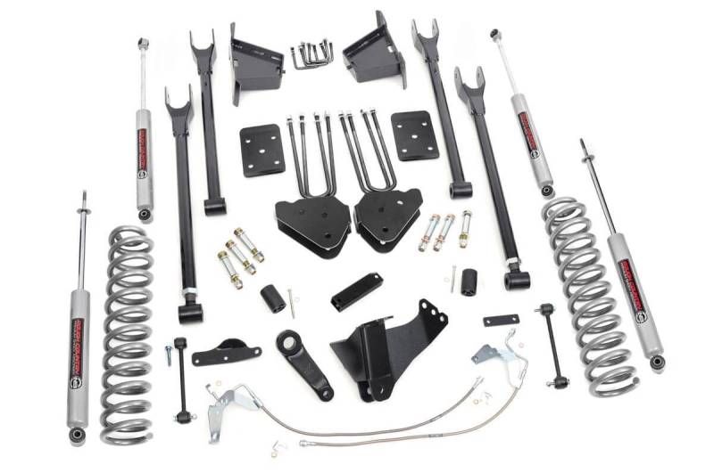 Compliment your 08-10 Ford F-250/350's aggressive, good looks with Rough Country's 4-Link Suspension Lift System. Rough Country's 8-inch Lift Kit was engineered to retain the F-250/350's impressive factory specs while bumping up performance and durability where it's needed most. The result is an aggressive, lifted beast with a mean profile and balanced on and off-road ride quality.\ When changing a vehicle's suspension, the key to preserving ride quality is in keeping the geometry of all suspension components as close to their factory angles as possible. Rough Country's 4-Link Suspension Lift System features a set of ultra-durable radius arm drop brackets, precision fit to bolt right into the factory mounts for an easier install and a more factory-like angle.\ This all-inclusive kit also features an adjustable lower control arms at the axle to allow caster adjustment as well as a track bar relocation bracket and a drop pitman arm. A full set of N3 Shocks provide a truly balanced ride quality for on and off-road use - prefect for daily drivers. This kit also ships with a set of durable, lifted coil springs and brake line relocation brackets.\ This innovative kit design features a 100% bolt-on installation process that is lightning fast compared to other kits this size. Save time and money with no need for cutting, drilling, or other complicated procedures. Rough Country's Rough Country's 4-Link Suspension Lift System is backed by our Lifetime Replacement Warranty.