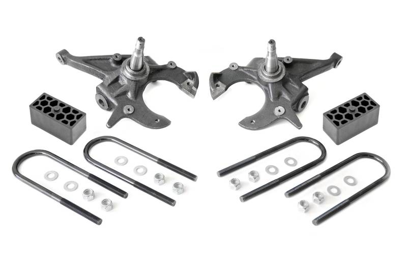 If you want to easily transform the look of your truck, look no further than Rough Country's 2in / 2.5in Lowering Kit for 82-04 Chevy S-10 pickups. Our easy-to-install Lowering Kit is a total transformation, offering a sleek, modern look that keeps heads turning!\ \ A set of sturdy Driver and Passenger Lowering Spindles offer plenty of strength and durability while helping maintain a factory-like ride. Also included are a set of Fabricated rear blocks, offering superior strength and reliability over cast blocks. All together, this kit drops the ride height of your S-10, S-15, Blazer or Jimmy by 2in in the front and 2.5in in the rear, offering a sleek, level drop while keeping other crucial components in line. Best of all, This easy-to-install lowering kit features a simple, 100% bolt-on installation process.