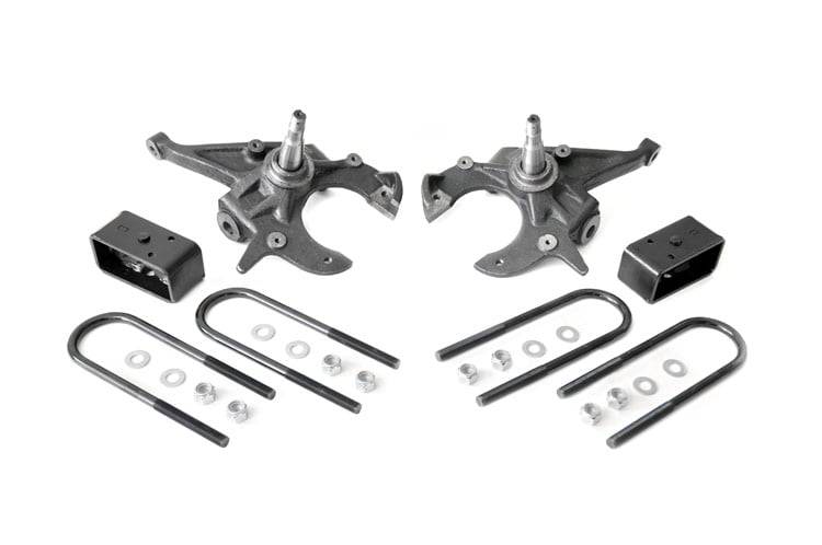 If you want to easily transform the look of your truck, look no further than Rough Country's 2in / 3in Lowering Kit for 82-04 Chevy S-10 pickups. Our easy-to-install Lowering Kit is a total transformation, offering a sleek, modern look that keeps heads turning!\ \ A set of sturdy Driver and Passenger Lowering Spindles offer plenty of strength and durability while helping maintain a factory-like ride. Also included are a set of Fabricated rear blocks, offering superior strength and reliability over cast blocks. All together, this kit drops the ride height of your S-10, S-15, Blazer or Jimmy by 2in in the front and 3in in the rear, offering a sleek, level drop while keeping other crucial components in line. Best of all, This easy-to-install lowering kit features a simple, 100% bolt-on installation process.