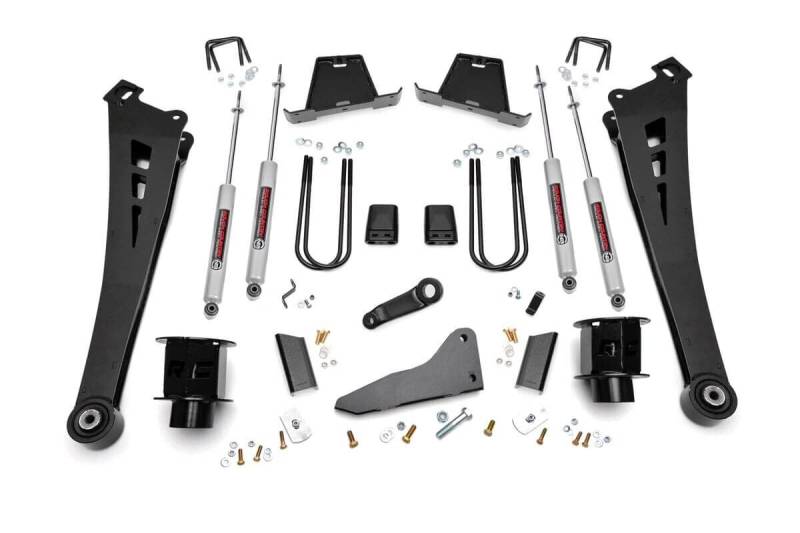 Compliment your RAM 3500's aggressive, good looks with Rough Country's new 5-inch Lift Kit. New model RAM Trucks come with a wealth of impressive features right from the factory. Rough Country's new 5-inch kit was engineered to retain these impressive factory specs while bumping up performance and durability where it's needed most. The result is an aggressive, lifted beast with an mean profile and lush ride-quality that'll make other RAM owners wonder where you got yours from!\ \ When changing a vehicle's suspension, the key to preserving ride quality is in keeping the geometry of all suspension components as close to their factory angles as possible. Rough Country's new 5-inch Suspension kit features a set of ultra-durable Radius Arms, precision fit to bolt right into the factory mounts for an easier install and a more factory-like angle. These beefy, upgraded Radius Arms also feature a durable, durable rubber bushings for maximum vibration absorption. In a further effort to preserve the truck's factory ride, this kit retains the factory progressive rate coil spring -- designed by Dodge specifically for the weight and ride quality of these new model trucks.\ \ Get the look you really want for your truck with an easy-to-install kit, at an incredible price!