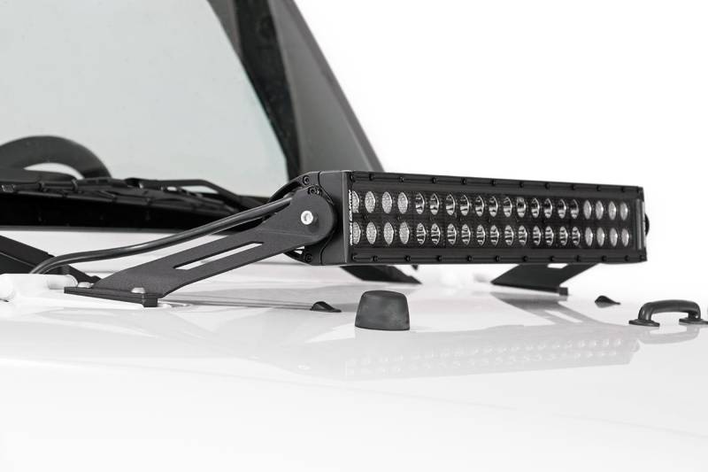 Rough Country's 20-inch LED Hood Mount makes it easy to add extra off-road lighting and the aggressive good looks that go with it. Easily attach our 20-inch LED Light Bars to your Jeep JK with no cutting or drilling required! This durable, bolt-on light mount attaches to your Jeep's hood using the existing hood hinge mounting point. Includes our Lifetime Replacement Warranty!
