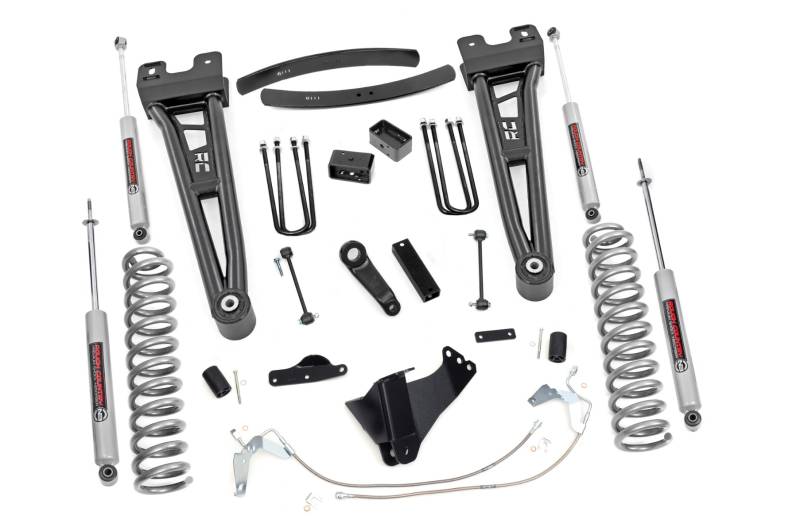 Compliment your 08-10 Ford F-250/350's aggressive, good looks with Rough Country's 6-inch Radius Arm Lift Kit. Rough Country's 6-inch Lift Kit was engineered to retain the F-250/350's impressive factory specs while bumping up performance and durability where it's needed most. The result is an aggressive, lifted beast with a mean profile and balanced on and off-road ride quality.\ \ When changing a vehicle's suspension, the key to preserving ride quality is in keeping the geometry of all suspension components as close to their factory angles as possible. Rough Country's new 6-inch Radius Arm Suspension Lift features a set of ultra-durable Radius Arms, precision fit to bolt right into the factory mounts for an easier install and a more factory-like angle. At 27lbs each, these beefy, upgraded Radius Arms dwarf stock equipment while and feature durable durable rubber bushings for maximum vibration absorption.\ \ This all-inclusive kit also features an adjustable alignment cam at the axle to allow caster adjustment as well as a track bar relocation bracket and a drop pitman arm. A full set of N3 Shocks provide a truly balanced ride quality for on and off-road use - prefect for daily drivers. This kit also ships with a set of durable, lifted coil springs and brake line relocation brackets.\ \ This innovative kit design features a 100% bolt-on installation process that is lightning fast compared to other kits this size. Save time and money with no need for cutting, drilling, or other complicated procedures. Rough Country's 6-inch Radius Arm Lift Kit is backed by our Lifetime Replacement Warranty.