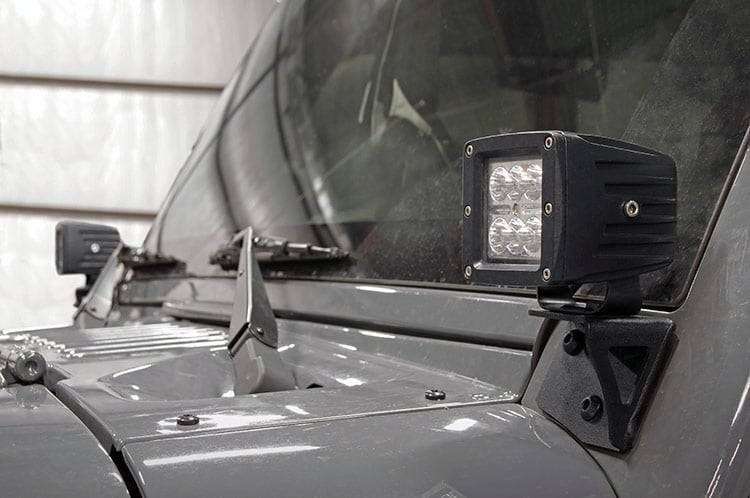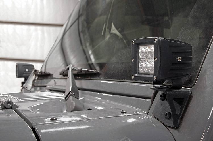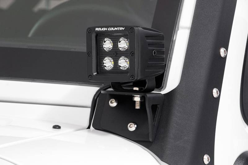 Rough Country's unique Lower Windshield Mounts place your 4-inch Round LED Lights or 2-inch CREE Square LED Lights flared out between your Wrangler's windshield and hood. This classic-looking setup gives your Jeep a commanding presence and military Jeep feel. These durable mounting brackets are easy to install and ready to withstand the harshest of elements. Fits any aftermarket lights with a 5/16-inch or 8mm post!