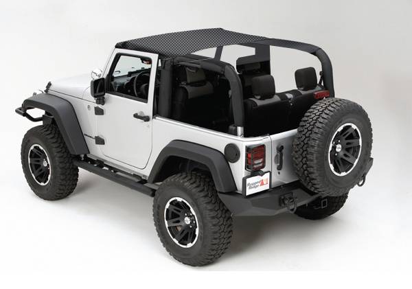 This black mesh summer brief top from Rugged Ridge fits 10-18 Jeep Wrangler JK. Special UV treated mesh fabric blocks the heat while allowing the cool breeze to flow through. The special weave of the Rugged Ridge mesh brief/Island Topper is designed for strength and durability while providing open air protection from the suns heat. Available in two great styles: the Summer Brief that goes to the center hoop and the Island Topper that goes back to cover those rear seat passengers. Don't forget the Header/Windshield channel needed to install these tops!