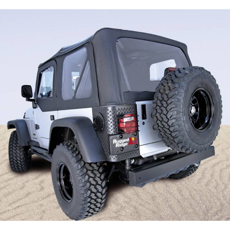 Rugged Ridge Fabric Replacement Soft Top has been developed out of years of industry research and engineering. Our trained staff of Jeep experts have developed an entire program that offers the best value, selection and design of any Fabric Soft Top offering. Each Fabric Soft Top is specifically designed to easily fit the factory original soft top hardware. Simply take off the old top and slip on the new. It is just that easy! All Rugged Ridge Soft Tops feature durable vinyl coated polyester and cotton fabric and tinted DOT approved glass windows that will last the test of time. All sewn seams use marine grade thread to make sure it does not deteriorate or discolor in the sun. Each seam is literally welded shut with durable heat seal tape to keep moisture out while keeping the original look of the top intact. Attaching the Rugged Ridge Top is easy with the factory original belt rail attachment method; simply tuck under the rail and go! All our tops feature two choices of door options as Jeep offered the 97-06 Wrangler with upper soft doors or with full hard doors. Rugged Ridge makes a Replacement Top that fits either!
