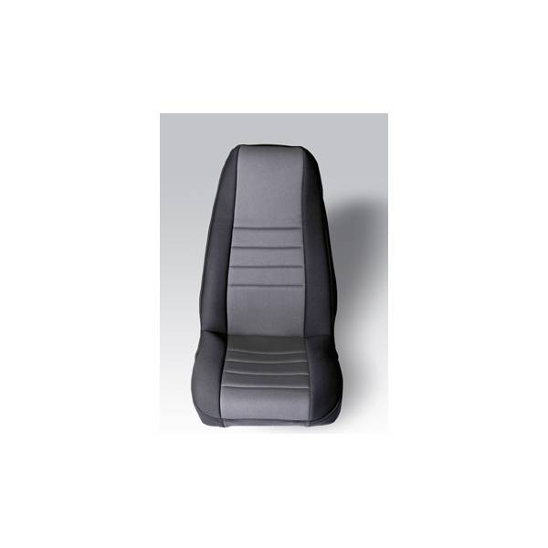 Neoprene seat cover, Rugged Ridge, fronts (pair), gray, 76-90 Wrangler Custom Fit Neoprene Seat Covers. These covers are constructed of durable neoprene creating the best looking custom seat cover available. Rugged Ridge does not use that cheap stretch nylon on their seat covers! Neoprene (wet suit material) is a great fabric to protect your seats from dirt, water and whatever mother nature can throw at you. No more burned legs from hot vinyl seats! Each cover is custom tailored for your Jeep's original equipment seat style making your seats look like they have been recently reupholstered. Installation is easy with special designed elastic cords, nylon straps and hooks that attach to your seat and to the seat cover mounting points. The center portion (color) goes all the way to the top of the seat.
