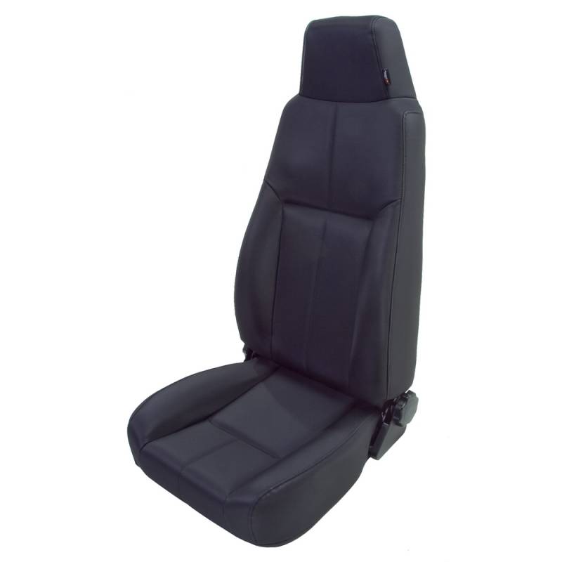 Seat, High-Back, Front, Reclinable, Black Denim; 76-02 CJ/Wrangler This replacement seat is constructed of durable automotive grade vinyl that is designed to match your vehicles interior. The style matches the original Jeep look with an integrated late-model style headrest, horizontal stitching, and adjustable recline to ensure proper driving position and comfort. This seat uses the original mounting hardware and bolts from the factory seats. 97-02 Jeep Wrangler Require Seat Adapters 13201.11 (Left Side) and 13201.12 (Right Side).