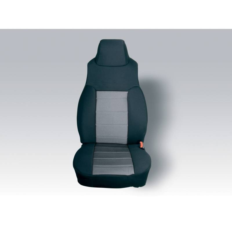 Seat cover, Rugged Ridge, fabric fronts (pair), gray, 91-95 Wrangler Custom Fit UV treated Poly Cotton Seat Covers from Rugged Ridge. These covers are constructed of tough poly cotton fabric creating the best looking custom seat cover available. Rugged Ridge does not use that cheap stretch nylon on their seat covers! Poly Cotton is a great fabric to protect your seats from dirt, sweat and heat from the sun. No more burned legs from hot vinyl seats! Each cover is custom tailored for your Jeep's original equipment seat style making your seats look like they have been recently reupholstered. Installation is easy with special designed elastic cords, nylon straps and hooks that attach to your seat and to the seat cover mounting points. The center portion (color) goes all the way to the top of the seat.