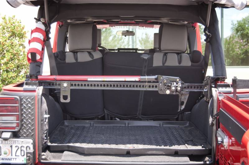 Jack Roll Bar Mounting Bracket; 92-18 Jeep Wrangler YJ/TJ/JK Get your Hi Lift style jack out of the elements with this roll bar mounting kit from Rugged Ridge. Storing your jack outside leaves it vulnerable to water, debris, ice and theft. These great new brackets allow you to secure your jack to the sports bar without sacrificing cargo area storage and increase the longevity and function of your jack! The simple no drill installation allows for easy removal and storage of the jack.