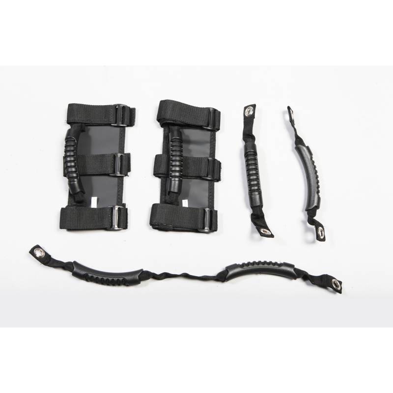 Grab Handle Kit, Neoprene; 07-18 Jeep Wrangler JK This five piece black grab handle kit contains a pair of Rugged Ridge Ultimate Grab Handles, a pair of rear side grab handles and the rear dual grab strap. Constructed of tough nylon webbing with a molded sure-grip handle, these Ultimate Grab Handles are available in two colors to accent your Jeep's interior-red and black. Will fit 2" or 3" padded or un-padded sport bars. All designs are packed in pairs.