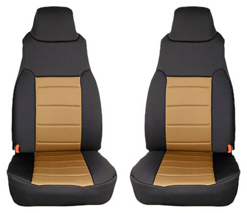 Seat Cover Kit, Front, Neoprene, Tan; 97-02 Jeep Wrangler TJ Custom Fit Neoprene Seat Covers. These covers are constructed of durable neoprene creating the best looking custom seat cover available. Rugged Ridge does not use that cheap stretch nylon on their seat covers! Neoprene (wet suit material) is a great fabric to protect your seats from dirt, water and whatever mother nature can throw at you. No more burned legs from hot vinyl seats! Each cover is custom tailored for your Jeep's original equipment seat style making your seats look like they have been recently reupholstered. Installation is easy with special designed elastic cords, nylon straps and hooks that attach to your seat and to the seat cover mounting points. The center portion (color) goes all the way to the top of the seat.