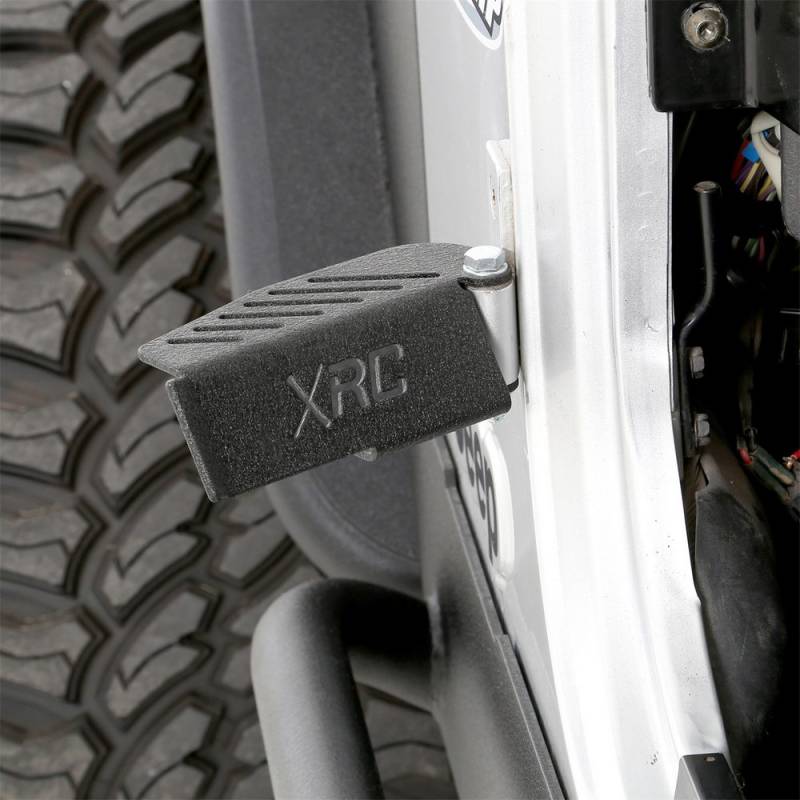 Enhance your driving experience Smittybilt Jeep Foot Pegs, designed for both front and rear hinges. These foot pegs are crafted from durable 1/8" CNC steel and finished with a signature series matte black textured powder coat for a sleek, aggressive look. Featuring exclusive bolt engagement to eliminate flex and rattling, along with a rubber trim gasket to protect your paint, these foot pegs offer both comfort and style during doors-off driving. Sold as a pair, they’re the perfect upgrade for enjoying the open road with ease. *Note: Always check local laws before driving with doors off.