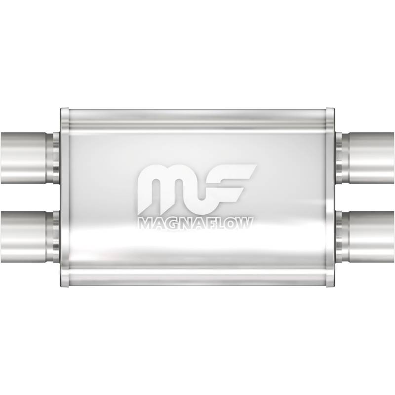 Straight-Through Performance Muffler; 2.5in. Dual/Dual; 4x14x9 Body The MagnaFlow 4 X 9in. Oval Straight-Through Performance Exhaust Muffler 11386 is engineered to enhance your ride with a healthy helping of our signature exhaust sound and dyno-proven performance thanks to its free-flowing straight-through perforated stainless steel core wrapped in stainless steel mesh and acoustic fiber fill. The reversible, universal 2.5/2.5in. diameter inlet/outlet Straight-Through layout allows you to install it in whatever orientation and configuration you see fit. However, professional installation is highly recommended. Muffler 11386s weight-optimized 4x9x14in. oval-shaped body features a satin finish that elevates the overall aesthetics of your current exhaust setup. 11386 is made of durable, corrosion resistant stainless steel and produced using cutting-edge CNC precision robotic manufacturing techniques, all backed by MagnaFlow's limited lifetime construction warranty. Delivers a Smooth, Deep Tone Mufflers are Bi-Directional 100% Stainless Steel