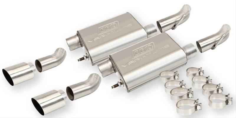 2010-2015 CAMARO SS 6.2L VARITUNE AXLE BACK EXHAUST KIT (439 STAINLESS) These new BBK Varitune axle back exhaust systems feature BBK Varitune mufflers that have a patented adjustable power valve inside that allows full adjustment of the exhaust flow through the mufflers chambers for a great sound and added performance. This adjustment is made at the rear of the muffler with a wrench by either moving the valve in or out. Once you are happy with the level of sound, it is locked in place with the Varitune locking nut. All of the Varitune power valves are made with stainless steel for lasting durability and smooth operation. These patented BBK Varitune exhaust systems allow you to personalize the power and sound levels of your car 8-10 decibels and 10-15 horsepower. All kits are available in 439 stainless steel and are offered as direct bolt on replacements for the restrictive factory exhaust. Every Varitune exhaust kit includes BBK Varitune laser etched logo 4" brushed stainless steel tips for impressive looks. Fits - 2010-2015 Camaro SS 6.2L LS3 & L99 Coupe Only 439 Stainless - Fully Adjustable Varitune Mufflers Add Great Sound And Performance - 4 inch Brushed Tips