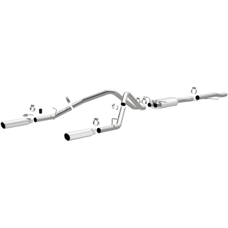 Street Series Polished Cat-Back System The MagnaFlow Street Series Cat-Back Performance Exhaust System 15565 brings out the personality of your Truck with our signature resonant, powerful engine tone and dyno-proven performance. Thanks to its fast-flowing, mandrel bent 3in. main piping and 1 Straight-Through mufflers ending in a Dual Split Rear exit with 3.5in. Polished Clamp-On Single Wall Angle Cut Rolled Edge tips, this Truck exhaust kit has the performance chops to match its sporty sound and appearance. Upgrade your ride to the next level with an exhaust that has the pipes to put other Truck's to shame. With this system your vehicle will be producing Aggressive exterior and Moderate interior sound levels while leaving other cars and trucks feeling envious at every stoplight. Exhaust kit 15565 features a cat-back layout that replaces your ride's stock exhaust components from near the catalytic converter on back. Extensive 3D scanning during development has resulted in a direct-fit design that you can easily install yourself. 15565 is produced using CNC precision robotic manufacturing techniques and is backed by MagnaFlow's 1-year limited finish warranty and limited lifetime construction warranty. Dyno-proven performance