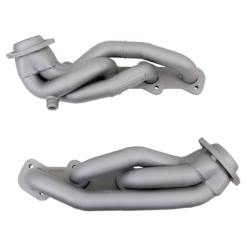 99-03 FORD F150 97-02 FORD EXP 5.4L 1-5/8 SHORTY HEADERS (TITANIUM CERAMIC) These BBK Performance shorty tuned Length exhaust Headers are designed and constructed as direct fit replacements for all 99-04 Ford 5.4L F150 truck applications. Each header is manufactured with 1-5/8" CNC mandrel bent tubing that offers unrestricted exhaust flow for increased horsepower and torque over factory OEM manifolds. BBK tuned Length headers offer improved scavenging waves for better combustion, which leads to improved performance and fuel economy over stock or equal Length headers. As with all BBK Performance exhaust headers they feature a 3/8" laser cut flange for additional strength and a guaranteed leak free fit. All headers are robotically and precision hand welded and then pressure tested to ensure years of reliability and performance in the real world. All BBK exhaust headers are available in a bright chrome or polished silver ceramic coated finish and include new exhaust header gaskets, header bolts and hardware to complete the installation. 50 State Legal - CARB APPROVED Titanium Ceramic Finish - All Required Gaskets and Hardware Included - Direct Bolt-On for Easy Installation - 50 State Legal