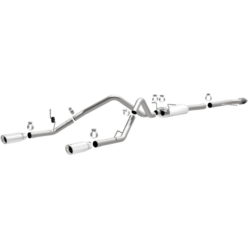 Street Series Polished Cat-Back System The MagnaFlow Street Series Cat-Back Performance Exhaust System 15268 brings out the personality of your Truck with our signature resonant, powerful engine tone and dyno-proven performance. Thanks to its fast-flowing, mandrel bent 3in. main piping and 1 Straight-Through mufflers ending in a Dual Split Rear exit with 4in. Polished Clamp-On Double Wall Angle Cut Rolled Edge tips, this Truck exhaust kit has the performance chops to match its sporty sound and appearance. Upgrade your ride to the next level with an exhaust that has the pipes to put other Truck's to shame. With this system your vehicle will be producing Aggressive exterior and Moderate interior sound levels while leaving other cars and trucks feeling envious at every stoplight. Exhaust kit 15268 features a cat-back layout that replaces your ride's stock exhaust components from near the catalytic converter on back. Extensive 3D scanning during development has resulted in a direct-fit design that you can easily install yourself. 15268 is produced using CNC precision robotic manufacturing techniques and is backed by MagnaFlow's 1-year limited finish warranty and limited lifetime construction warranty. Dyno-proven performance