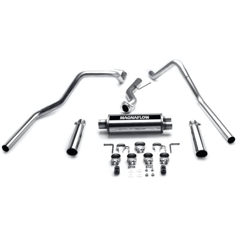 Street Series Stainless Cat-Back System The MagnaFlow Street Series Cat-Back Performance Exhaust System 15753 brings out the personality of your Truck with our signature resonant, powerful engine tone and dyno-proven performance. Thanks to its fast-flowing, mandrel bent 3in. main piping and 1 Straight-Through mufflers ending in a Dual Split Rear exit with 3.5in. Polished Clamp-On Single Wall Angle Cut Rolled Edge tips, this Truck exhaust kit has the performance chops to match its sporty sound and appearance. Upgrade your ride to the next level with an exhaust that has the pipes to put other Truck's to shame. With this system your vehicle will be producing Aggressive exterior and Moderate interior sound levels while leaving other cars and trucks feeling envious at every stoplight. Exhaust kit 15753 features a cat-back layout that replaces your ride's stock exhaust components from near the catalytic converter on back. Extensive 3D scanning during development has resulted in a direct-fit design that you can easily install yourself. 15753 is produced using CNC precision robotic manufacturing techniques and is backed by MagnaFlow's 1-year limited finish warranty and limited lifetime construction warranty. Durable corrosion-resistant stainless steel construction CNC precision robotic manufacturing techniques Dyno-proven performance