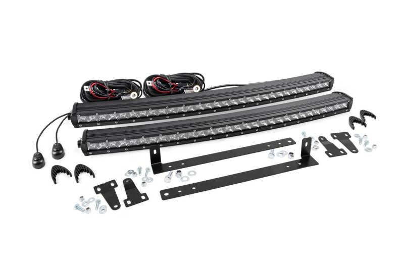 A fan-favorite add-on that looks like factory equipment, Rough Country's 30-inch Single-Row Light Bar Grille Mount Kit for the Ford F-150 includes everything you need to mount our 30-inch curved single row LED Light Bar in the factory opening of your truck's grille. This innovative setup makes for a clean, flush look that's sure to turn heads.This easy-to-install kit features our 30-inch single-row curved CREE LED light bar, offering enormous lighting power in a sleek and stylish, modern frame. With a powerful 12,000 Lumens and 150 Watt output, this LED light is a sight to behold. Rough Country LED Light Bars feature our 3-Year Manufacturer's Warranty and our mounts are backed by our Lifetime Replacement Guarantee.\ \