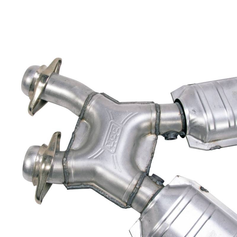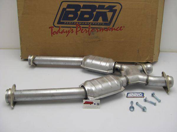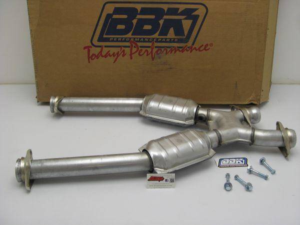 1996-2004 MUSTANG GT 2-1/2 SHORT MID X PIPE W/CONVERTERS BBK Performance short mid X pipes with catalytic converters are specifically designed to be used with BBK full Length exhaust headers to complete the exhaust installation to your cars cat back exhaust system. This BBK mid pipe is designed and built with 2-1/2" CNC mandrel bent tubing for maximum exhaust flow and high flow catalytic converters. All BBK mid pipes feature ball and socket style connectors for simple installation and adjustment for good ground clearance. The BBK merged X center section crossover is designed to maximize the exhaust flow potential of your Mustangs high performance engine to get the maximum horsepower and torque available to the ground. Every BBK mid X pipe offers performance, quality and value that guarantees years of top performance for your Mustang. CNC Mandrel Bent 2-1/2 Tubes - High Flow Catalytic Converters - X Center Section