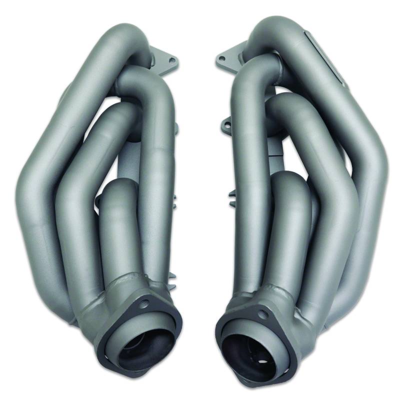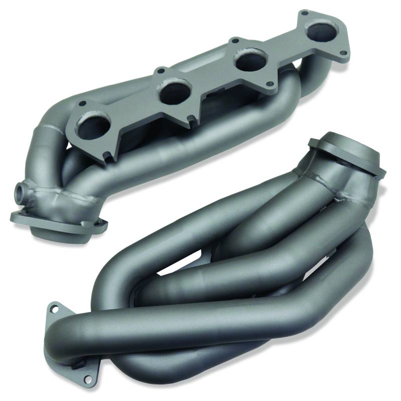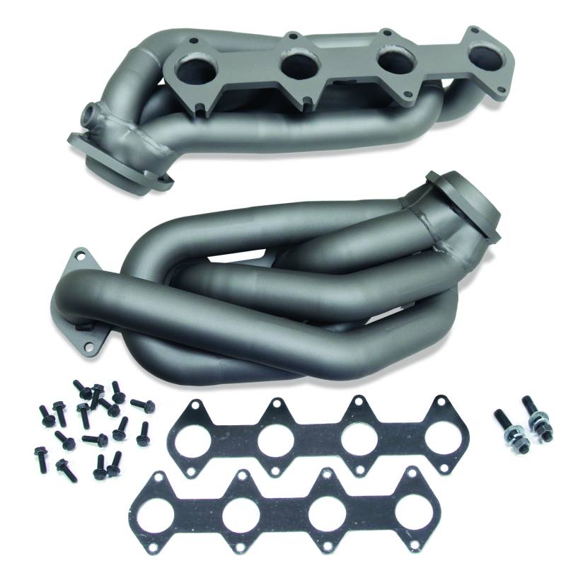 2005-2010 MUSTANG GT 1-5/8 SHORTY TUNED LENGTH HEADERS (TITANIUM CERAMIC) These BBK Performance shorty tuned Length exhaust Headers are designed and constructed as direct fit replacements for all 2005-10 Mustang GT applications. Each header is manufactured with 1-5/8" CNC mandrel bent tubing that offers unrestricted exhaust flow for increased horsepower and torque over factory OEM manifolds. BBK tuned Length headers offer improved scavenging waves for better combustion, which leads to improved performance and fuel economy over stock or equal Length headers. As with all BBK Performance exhaust headers they feature a 3/8" laser cut flange for additional strength and a guaranteed leak free fit. All headers are robotically and precision hand welded and then pressure tested to ensure years of reliability and performance in the real world. All BBK exhaust headers are available in a high temp titanium ceramic or polished silver ceramic coated finish and include new exhaust header gaskets, header bolts and hardware to complete the installation. Direct Fit Replacement - 50 State Legal - CARB Approved - Titanium Ceramic Finish