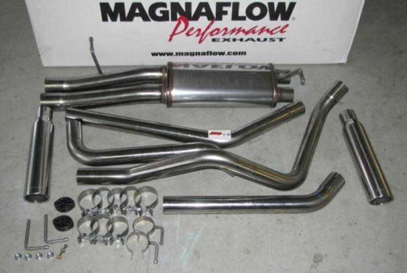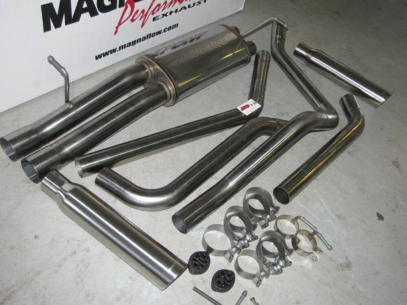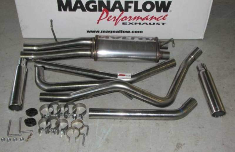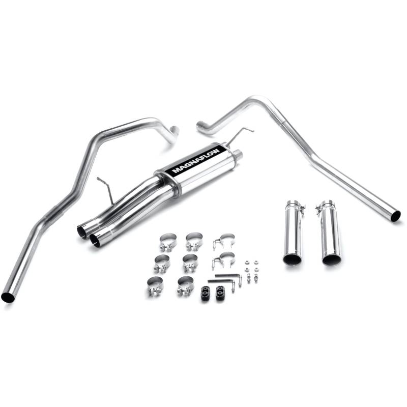 Street Series Polished Cat-Back System The MagnaFlow Street Series Cat-Back Performance Exhaust System 15829 brings out the personality of your Truck with our signature resonant, powerful engine tone and dyno-proven performance. Thanks to its fast-flowing, mandrel bent 3in. main piping and 1 Straight-Through mufflers ending in a Dual Split Rear exit with 3.5in. Polished Clamp-On Single Wall Angle Cut Rolled Edge tips, this Truck exhaust kit has the performance chops to match its sporty sound and appearance. Upgrade your ride to the next level with an exhaust that has the pipes to put other Truck's to shame. With this system your vehicle will be producing Aggressive exterior and Moderate interior sound levels while leaving other cars and trucks feeling envious at every stoplight. Exhaust kit 15829 features a cat-back layout that replaces your ride's stock exhaust components from near the catalytic converter on back. Extensive 3D scanning during development has resulted in a direct-fit design that you can easily install yourself. 15829 is produced using CNC precision robotic manufacturing techniques and is backed by MagnaFlow's 1-year limited finish warranty and limited lifetime construction warranty. CNC precision robotic manufacturing techniques