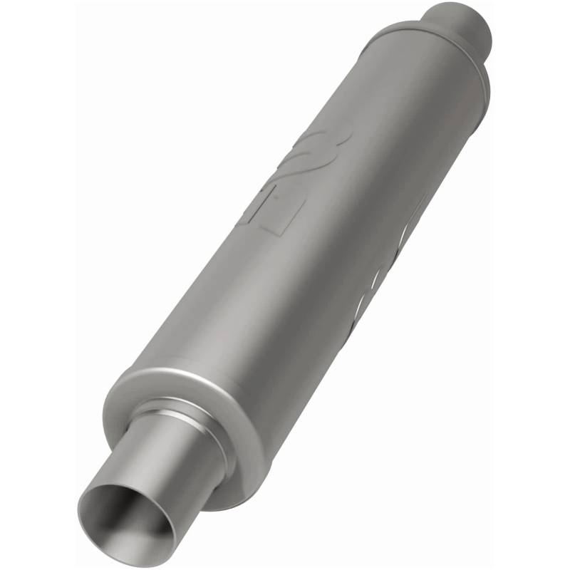 Straight-Through Performance Muffler; 2.25in. Center/Center; 4x18x4 Body The MagnaFlow 4in. Round Straight-Through Performance Exhaust Muffler 10425 brings our world-famous exhaust sound and dyno-proven performance to your ride in a weight-optimized 4x4x18in. package with a premium satin finish. The straight-through free-flowing design of this round-bodied muffler's reversible, universal 2.25/2.25in. diameter inlet/outlet layout enables versatile installation options to match the spacing requirements of your vehicle. Due to the cutting and welding involved, professional installation is highly recommended. Internally, 10425 utilizes a perforated stainless steel core wrapped in stainless steel mesh and acoustic fiber fill to achieve a powerful, resonant tone. This muffler is made of durable, corrosion resistant stainless steel and produced using cutting-edge CNC precision robotic manufacturing techniques, all backed by MagnaFlow's limited lifetime construction warranty. Delivers a Smooth, Deep Tone Mufflers are Bi-Directional 100% Stainless Steel