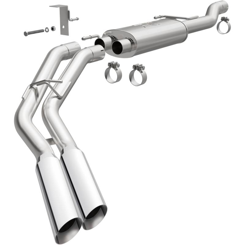 Street Series Stainless Cat-Back System The MagnaFlow Street Series Cat-Back Performance Exhaust System 16868 brings out the personality of your Truck with our signature resonant, powerful engine tone and dyno-proven performance. Thanks to its fast-flowing, mandrel bent 3in. main piping and 1 Straight-Through mufflers ending in a Dual Same Side Before Passenger Rear Tire exit with 3.5in. Polished Welded-On Single Wall Angle Cut Edge tips, this Truck exhaust kit has the performance chops to match its sporty sound and appearance. Upgrade your ride to the next level with an exhaust that has the pipes to put other Truck's to shame. With this system your vehicle will be producing Very Aggressive exterior and Aggressive interior sound levels while leaving other cars and trucks feeling envious at every stoplight. Exhaust kit 16868 features a cat-back layout that replaces your ride's stock exhaust components from near the catalytic converter on back. Extensive 3D scanning during development has resulted in a direct-fit design that you can easily install yourself. 16868 is produced using CNC precision robotic manufacturing techniques and is backed by MagnaFlow's 1-year limited finish warranty and limited lifetime construction warranty. Durable corrosion-resistant stainless steel construction CNC precision robotic manufacturing techniques Dyno-proven performance