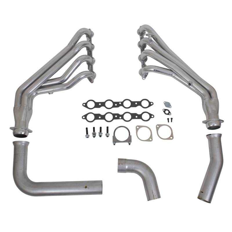 1999-02 GM FULL SIZE TRUCK 1-3/4 LONG TUBE HEADERS (POLISHED SILVER CERAMIC) BBK Performance full length long tube exhaust headers offer unsurpassed quality and fitment using top quality materials and American craftsmanship. Every long tube exhaust header system is hand built with CNC mandrel bent tubing for unrestrictive exhaust flow and maximum performance, 3/8" laser cut flanges, patented scavenging collector design and gasket less ball and socket connectors for easy installation. Every exhaust header has been designed specifically for your application to get the most horsepower and torque out of the engine. BBK long tube exhaust headers outperform the competition in quality value and performance. All headers are a direct fit bolt on replacement when used with the correct matching mid-pipes which are available with high flow catalytic converters. Our decades of exhaust design and experience make BBK Performance your number one choice for late model American car and truck performance exhaust.
