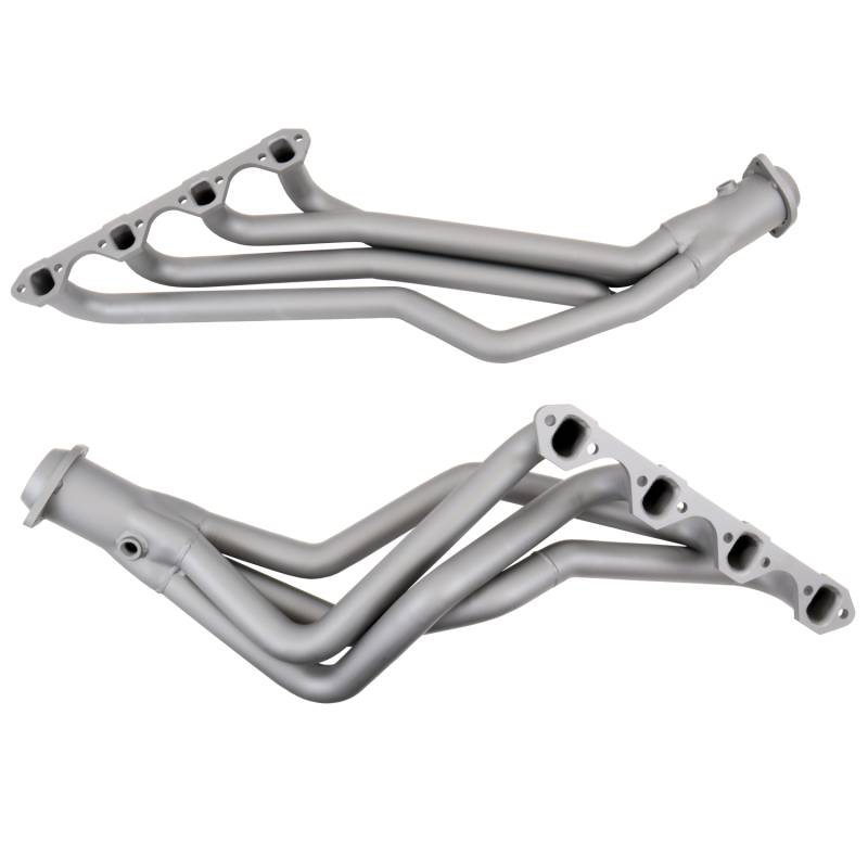 1979-1993 MUSTANG 5.0 1-5/8 LONG TUBE HEADERS AUTOMATIC (TITANIUM CERAMIC) BBK Performance full length long tube exhaust headers offer unsurpassed quality and fitment using top quality materials and American craftsmanship. Every long tube exhaust header system is hand built with CNC mandrel bent tubing for unrestrictive exhaust flow and maximum performance, 3/8" laser cut flanges, patented scavenging collector design and gasket less ball and socket connectors for easy installation. Every exhaust header has been designed specifically for your application to get the most horsepower and torque out of the engine. BBK long tube exhaust headers outperform the competition in quality value and performance. All headers are a direct fit bolt on replacement when used with the correct matching mid-pipes which are available with high flow catalytic converters and in off road race versions. Our decades of exhaust design and experience make BBK Performance your number one choice for late model American car and truck performance exhaust. Designed For AOD/E Transmission - Requires Mid Pipe Part# 1810 For Installation