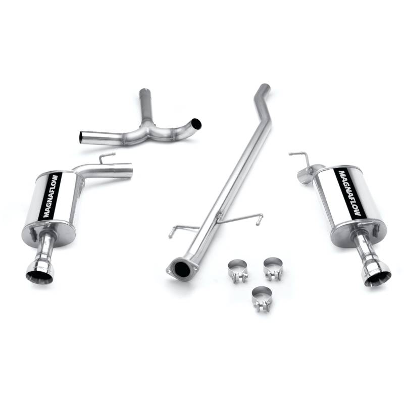 Street Series Stainless Cat-Back System The MagnaFlow 2006-2007 Mazda 6 Street Series Cat-Back Performance Exhaust System brings out the personality of your 2.3L 2006-2007 Mazda 6 with our signature resonant, powerful engine tone and dyno-proven performance. Thanks to its fast-flowing, mandrel bent 2.5in. main piping and 2 Straight-Through mufflers ending in a Dual Split Rear exit with 4in. Polished Welded-On Double Wall Angle Cut Folded Edge tips, this Mazda 6 exhaust kit has the performance chops to match its sporty sound and appearance. Upgrade your ride to the next level with an exhaust that has the pipes to put other Mazda 6's to shame. With this system your vehicle will be producing Moderate exterior and Mild interior sound levels while leaving other cars and trucks feeling envious at every stoplight. Exhaust kit 16609 features a cat-back layout that replaces your ride's stock exhaust components from near the catalytic converter on back. Extensive 3D scanning during development has resulted in a direct-fit design that you can easily install yourself. 16609 is produced using CNC precision robotic manufacturing techniques and is backed by MagnaFlow's 1-year limited finish warranty and limited lifetime construction warranty. Durable corrosion-resistant stainless steel construction CNC precision robotic manufacturing techniques Dyno-proven performance