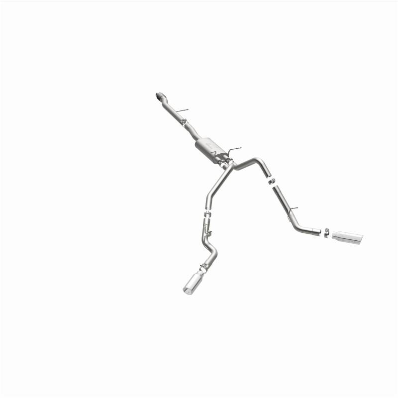 Street Series Polished Cat-Back System The MagnaFlow Street Series Cat-Back Performance Exhaust System 15269 brings out the personality of your Truck with our signature resonant, powerful engine tone and dyno-proven performance. Thanks to its fast-flowing, mandrel bent 3in. main piping and 1 Straight-Through mufflers ending in a Dual Split Rear Behind Rear Tires exit with 4in. Polished Clamp-On Double Wall Angle Cut Rolled Edge tips, this Truck exhaust kit has the performance chops to match its sporty sound and appearance. Upgrade your ride to the next level with an exhaust that has the pipes to put other Truck's to shame. With this system your vehicle will be producing Aggressive exterior and Moderate interior sound levels while leaving other cars and trucks feeling envious at every stoplight. Exhaust kit 15269 features a cat-back layout that replaces your ride's stock exhaust components from near the catalytic converter on back. Extensive 3D scanning during development has resulted in a direct-fit design that you can easily install yourself. 15269 is produced using CNC precision robotic manufacturing techniques and is backed by MagnaFlow's 1-year limited finish warranty and limited lifetime construction warranty. Durable corrosion-resistant stainless steel construction