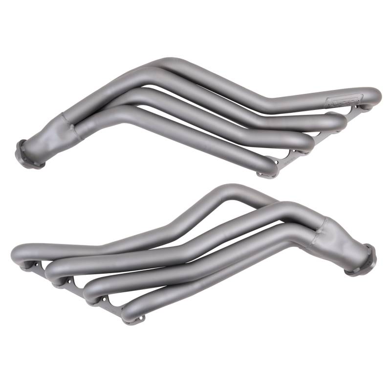 1986-1993 MUSTANG 1-3/4 LONG TUBE 351W SWAP HEADERS (TITANIUM CERAMIC) BBK Performance 1-3/4 full length long tube exhaust headers offer unsurpassed quality and fitment using top quality materials and American craftsmanship. Every long tube exhaust header system is hand built with CNC mandrel bent tubing for unrestrictive exhaust flow and maximum performance, 3/8" laser cut flanges, patented scavenging collector design and gasket less ball and socket connectors for easy installation. Every exhaust header has been designed specifically for your application to get the most horsepower and torque out of the engine. BBK long tube exhaust headers outperform the competition in quality value and performance. All headers are a direct fit bolt on replacement when used with the correct matching mid-pipes which are available with high flow catalytic converters. Our decades of exhaust design and experience make BBK Performance your number one choice for late model American car and truck performance exhaust. Fit Manual Transmission ONLY Manual Transmission ONLY - For Use on 351W Swap into a Fox Body - Titanium Ceramic Finish - 1-3/4 CNC Mandrel Bent Primary Tubes - Mid Pipe required for Installation