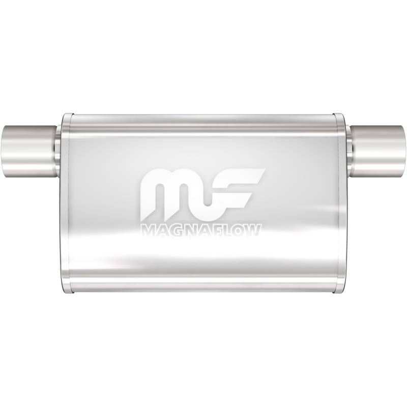 Straight-Through Performance Muffler; 2.5in. Offset Same Side; 4x14x9 Body The MagnaFlow 4 X 9in. Oval Straight-Through Performance Exhaust Muffler 14377 brings our signature sound and dyno-proven performance to your ride with a free-flowing straight-through perforated stainless steel core wrapped in stainless steel mesh and acoustic fiber fill, and a weight-optimized, reversible 2.5/2.5in. diameter inlet/outlet Straight-Through layout. Muffler 14377s 4x9x14in. oval-shaped body features a premium, brushed finish for an elevated aesthetic that matches the enhanced exhaust note and performance that this muffler brings to your ride. The universal design allows for flexible placement of 14377 within your exhaust system to meet the specific spacing requirements of your vehicle, although professional installation is highly recommended. 14377 is made of durable, corrosion resistant stainless steel and produced using cutting-edge CNC precision robotic manufacturing techniques, all backed by MagnaFlow's limited lifetime construction warranty. Delivers a Smooth, Deep Tone Mufflers are Bi-Directional 100% Stainless Steel