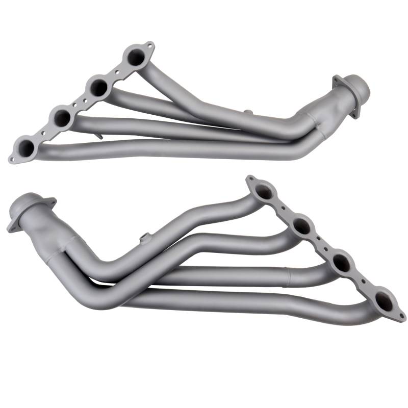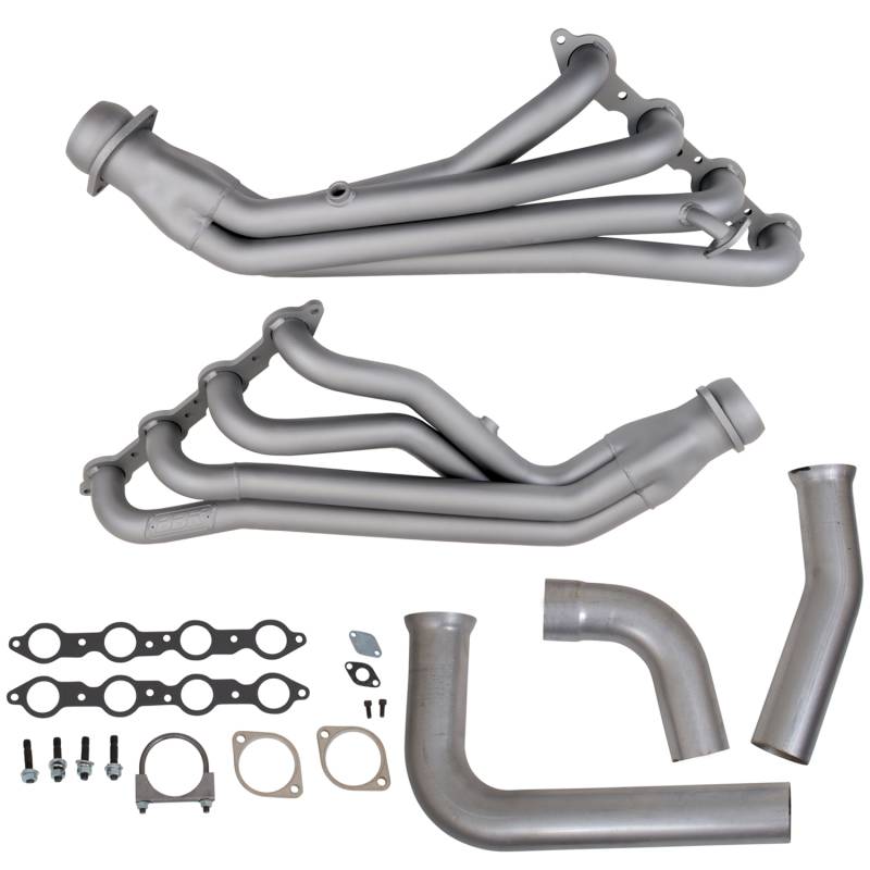 1999-02 GM FULL SIZE TRUCK 1-3/4 LONG TUBE HEADERS & Y PIPE (TITANIUM CERAMIC) BBK Performance full length long tube exhaust headers offer unsurpassed quality and fitment using top quality materials and American craftsmanship. Every long tube exhaust header system is hand built with CNC mandrel bent tubing for unrestrictive exhaust flow and maximum performance, 3/8" laser cut flanges, patented scavenging collector design and gasket less ball and socket connectors for easy installation. Every exhaust header has been designed specifically for your application to get the most horsepower and torque out of the engine. BBK long tube exhaust headers outperform the competition in quality value and performance. All headers are a direct fit bolt on replacement when used with the correct matching mid-pipes which are available with high flow catalytic converters. Our decades of exhaust design and experience make BBK Performance your number one choice for late model American car and truck performance exhaust. FITMENT NOTE: Does NOT Fit SUV / Suburban or 2000 Silverado 4.8L Single CAB 2WD Applications Because Of Steering Shaft Clearance 1-3/4" Primaries for Maximum Exhaust Flow - FITS 2WD & 4WD - Titanium Ceramic Finish
