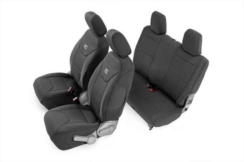 Want to protect your seats or are your seats showing signs of wear and tear from daily use? Say goodbye to unsightly stains and deterioration with Rough Country's Neoprene Seat Covers - the ultimate solution for preserving your vehicle's interior.Snug Fit for Optimal Protection: Our seat covers are tailored to fit your seats perfectly, providing a protective barrier against spills, scratches, and everyday wear and tear.Factory-Spec Construction: Engineered to meet factory specifications, our covers blend seamlessly with your vehicle's interior, giving it a fresh, new look without compromising on quality or style.Four-Layer Defense: With a four-layer construction featuring foam padding and a durable polyester shell, our seat covers offer unmatched protection and longevity, ensuring your seats stay looking new for years to come.Breathable and Water-Resistant: The neoprene layer not only provides breathability for added comfort but also boasts water-resistant properties, safeguarding your seats from spills and stains.Complete Coverage: Our covers come with full protection for your front seats, including headrest covers where applicable, as well as rear covers to shield your back seats from children and pet-related mishaps.Peace of Mind Warranty: Rest easy knowing your purchase is backed by our two-year warranty, giving you confidence in the durability and reliability of our product.Don't let worn-out seats diminish your driving experience. Upgrade to Neoprene Seat Covers today and enjoy a fresh, stylish interior that's protected against the rigors of daily life on the road.