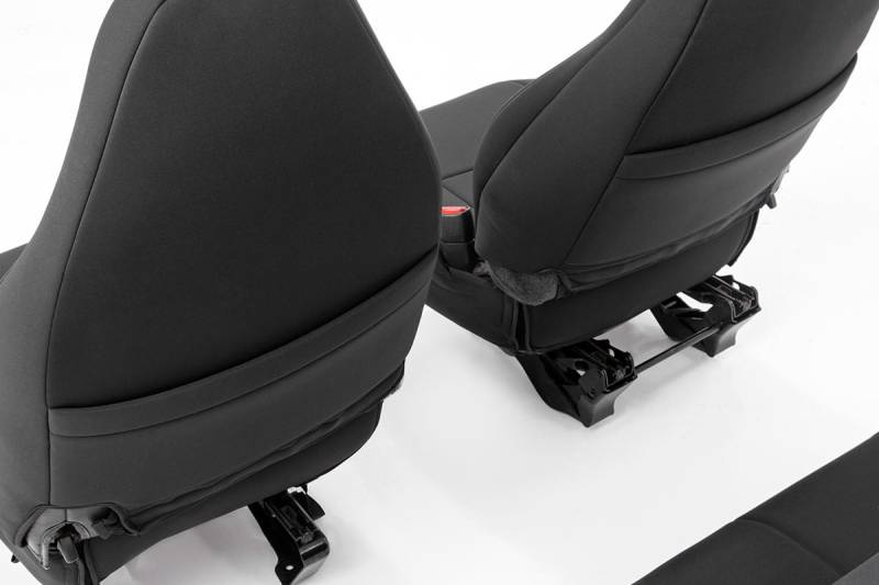 Want to protect your seats or are your seats showing signs of wear and tear from daily use? Say goodbye to unsightly stains and deterioration with Rough Country's Neoprene Seat Covers - the ultimate solution for preserving your vehicle's interior.Snug Fit for Optimal Protection: Our seat covers are tailored to fit your seats perfectly, providing a protective barrier against spills, scratches, and everyday wear and tear.Factory-Spec Construction: Engineered to meet factory specifications, our covers blend seamlessly with your vehicle's interior, giving it a fresh, new look without compromising on quality or style.Four-Layer Defense: With a four-layer construction featuring foam padding and a durable polyester shell, our seat covers offer unmatched protection and longevity, ensuring your seats stay looking new for years to come.Breathable and Water-Resistant: The neoprene layer not only provides breathability for added comfort but also boasts water-resistant properties, safeguarding your seats from spills and stains.Complete Coverage: Our covers come with full protection for your front seats, including headrest covers where applicable, as well as rear covers to shield your back seats from children and pet-related mishaps.Peace of Mind Warranty: Rest easy knowing your purchase is backed by our two-year warranty, giving you confidence in the durability and reliability of our product.Don't let worn-out seats diminish your driving experience. Upgrade to Neoprene Seat Covers today and enjoy a fresh, stylish interior that's protected against the rigors of daily life on the road.