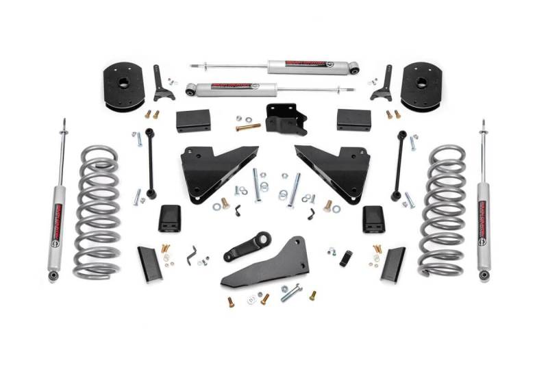 Compliment your RAM 2500's aggressive, good looks with Rough Country's 5-inch Lift Kit. New model RAM Trucks come with a wealth of impressive features right from the factory. Rough Country's 5-inch kit was engineered to retain these impressive factory specs while bumping up performance and durability where it's needed most. The result is a lifted beast with a mean profile and lush ride-quality that'll make other RAM owners wonder where you got yours from!Rough Country's 5-inch Lift Kit is designed for Dodge RAM's equipped with either factory rear coils or factory rear air ride suspension. On Air Ride models, this kit uses a rear air bag spacer that works with the factory air bag to provide rear lift. This kit also features a Rear Sensor Arm Relocation Bracket that can modify how the sensor link speaks to the computer to determine what the ride height is. This allows you to adjust the amount of rear height up to 1-inch higher than the front by way of multiple mounting points spaced by 1/4-inch. Pick the mounting point you want for the rear ride height you prefer.When changing a vehicle's suspension, the key to preserving ride quality is in keeping the geometry of all suspension components as close to their factory angles as possible. Rough Country's 5-inch Suspension kit features a set of Radius Arm Drop brackets allowing you to retain the beefy factory arms while keeping everything at optimum angles. This kit also features a set of front, lifted coil springs, anti-wrap rear blocks and N3 Shocks for a fantastic blend of smooth highway ride and awesome off-road performance.