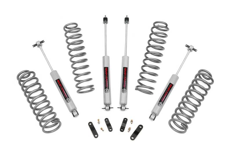 Elevate your Jeep's off-road capability and style with Rough Country's 2.5-Inch Suspension Lift Kit. Designed for larger wheels and tires, this kit increases ground clearance and delivers a bold, aggressive stance on and off the trail.Lifted Front and Rear Coil Springs: Enjoy a taller ride height while maintaining factory-like ride comfort. These coils are tuned to match the OEM spring rate, providing balanced handling whether you're navigating rocky terrain or cruising pavement.Configurable Shock Options: Choose the perfect ride feel for your driving needs. This kit offers nitrogen-charged N3 shocks, monotube V2 and M1 options, or the premium M1R remote reservoir shocks for ultimate performance and control.Hassle-Free Installation: This kit includes all necessary components for a simple, bolt-on installation, getting you trail-ready without complicated modifications.Trail-Tested Durability: Backed by Rough Country's Limited Lifetime Replacement Warranty, this suspension lift is built to handle harsh environments and rugged adventures.Upgrade your Jeep today and conquer the trail with Rough Country's 2.5-Inch Suspension Lift Kit, where performance meets unmistakable style.