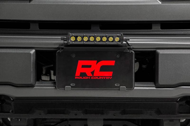 COMMAND THE DARK: Rough Country's Universal 8-inch License Plate LED Kit makes it easy to upgrade your vehicle's lighting capabilities on any standard-sized, front license plate location. Improve the look of your front bumper with this easy-to-install upgrade.This all-inclusive kit features an 8-inch single-row LED Light bar, mounting kit, light bar cover, and premium, braided wiring harness with an on/off switch. With 3,200 lumens and 40 watts of off-road lighting power mounted in a prime position, this kit provides ample illumination for navigating trails and can provide a handy source of light for working in front of your vehicle. Rough Country LED Light bars feature an IP67 waterproof housing, capable of withstanding elements like water, dirt and dust!This durable mounting solution features a backing plate that aligns perfectly with standard-sized license plate holes for easy installation, with plenty of room remaining to run a front license plate or novelty plate. Includes a lifetime warranty on the mounting system and 3-year light bar warranty.